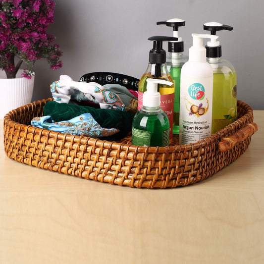 AKWAY Wicker Serving Tray Wooden Serving Tray for home | Dining table decorative trays | Serving tray for party guests | platter with handles Diwali or Deepawali Gifts | 10 x 10 x 2 (Beige)